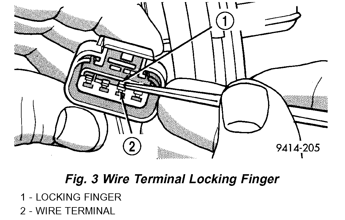 3. Using a small screwdriver lift locking finger away from terminal and push terminal out of connector (Fig. 3).