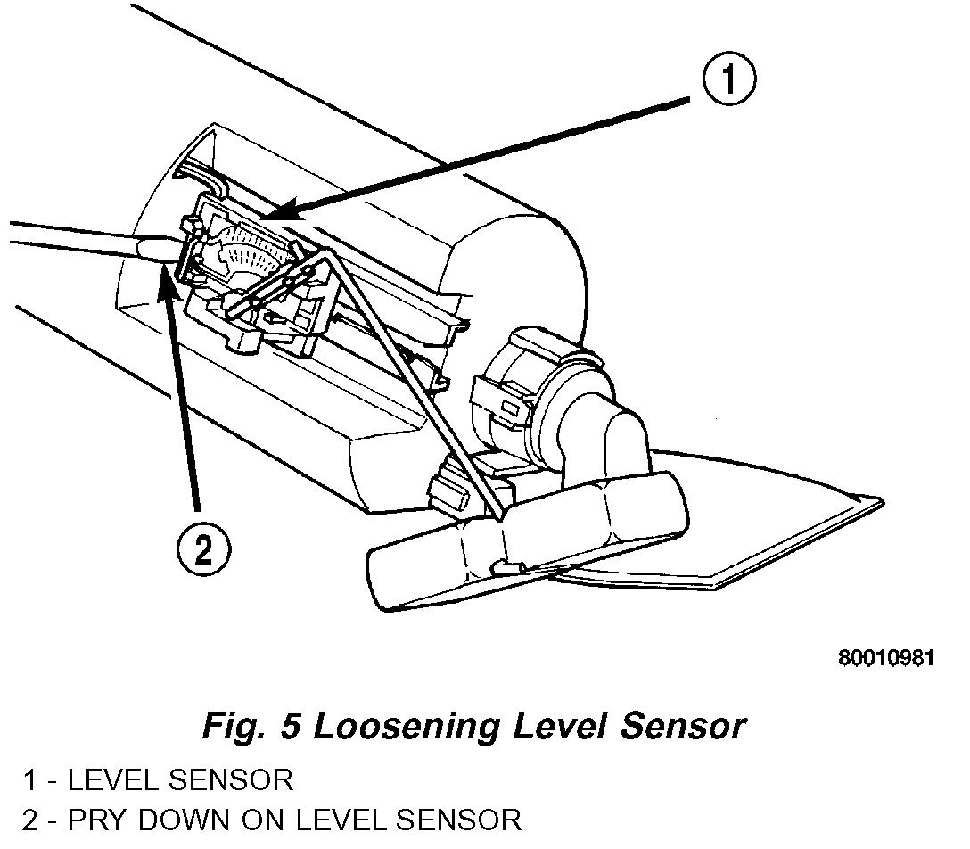 5. Insert a screwdriver between the fuel pump module and the top of the level sensor housing (Fig. 5). Push level sensor down slightly.
