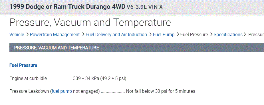 I attached the fuel specifications below for a 3.9L engine. Let me know which one you have if that is incorrect. (See pic 1)