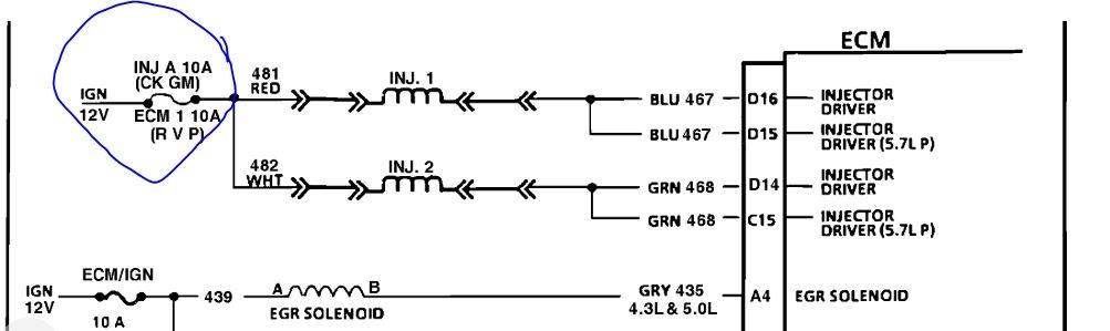 Can't get power from wire to one side of my TBI on the truck listed above k 1500. Switch plugs and still the same wire wont spray gas, both injectors work but no power to one wire. Please help.