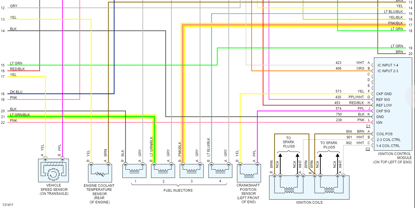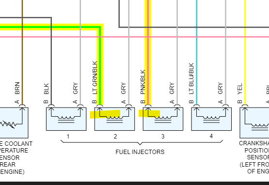 Okay, I'm not sure what you mean by free minute there. Let's start this again. You're getting a pulse on the control side of numbers 1 and 4, and on 2 and 3 the test light just stays lit. So, you're back probing the injector connectors for a pulse, so if 2 and 3 are just lighting the test light, that sounds like an open circuit in the control side of 2 and 3. The power feed is just going through the injector and lighting your test light, it's not being pulled to ground. So yes, you'll need to track down those control wires (2 and 3) and see where they are opened circuit or high resistance. I would think you are most likely going to find a corroded bulk connector somewhere. Unless some rodents got in there and chewed through a couple wires, that happens all the time, they love to chew on wires, I've seen that more times than I can count. Hopefully that's what it is, so there's no damage to the computer drivers.