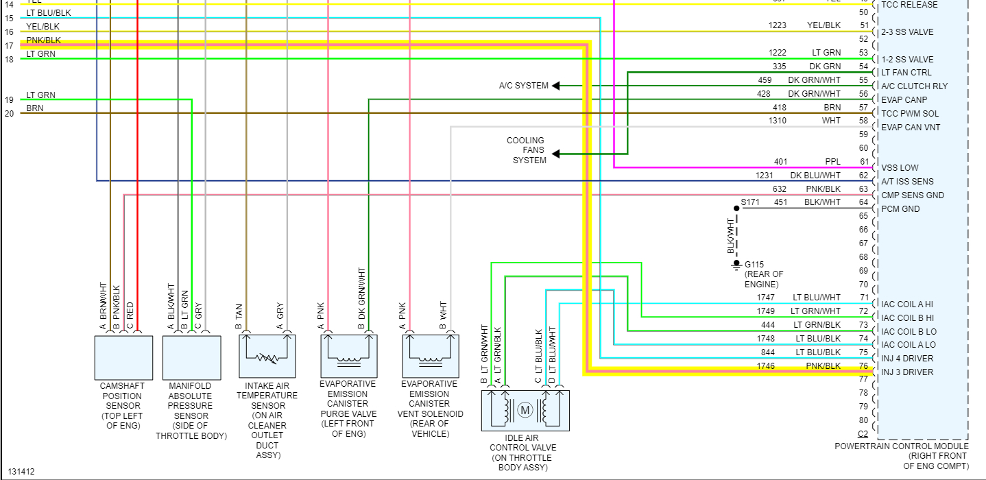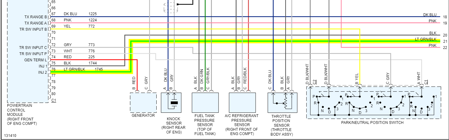 This is the OEM diagram for the injectors circuit, it doesn't show any connectors, just right to the ECM, and knowing these ECMs, you might want to check the ECM connectors for corrosion. I know they keep the computers in the engine compartment, and they are not really protected from the elements very well. And considering the age of the car, it might be easier just to trace the wires right from the ECM out. I had some strange issues with one of these cars, I had to go and test right at the ECM to find the issue.