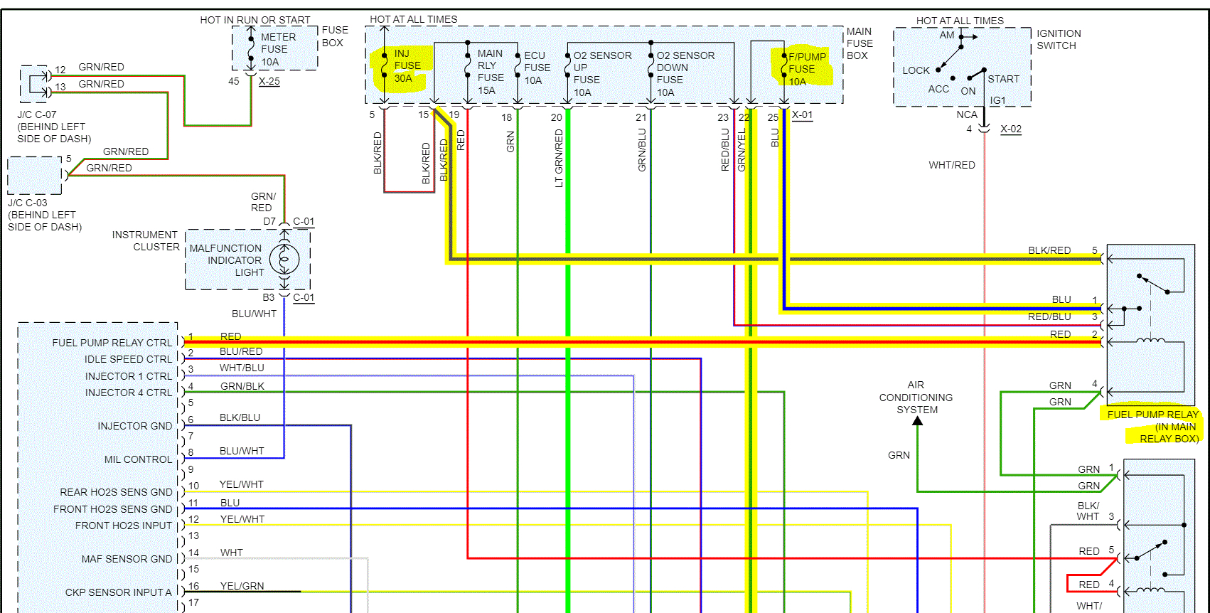 There are two fuses of interest. One is for the fuel pump and the other is for the fuel injectors. Here is how it works: When the fuel pump should turn on, the ECM sends power to the fuel pump relay primary circuit which energizes the coil in the relay. This closes the switch in the relay allowing power to flow from the fuel pump fuse to the pump.