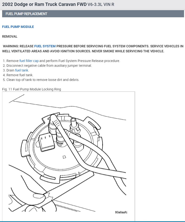 The fuel pump is located in fuel tank. Person who worked on the van bypassed the fuel pump with another fuel pump but it's still leaking at fuel pump that has been replaced. I rather do this correctly. If there's another way or to access the fuel pump in the tank? By the inside of the van? I figured it's either the fuel strainer or the fuel injectors are clogged. Would that cause the fuel pump to leak? I also don't know if the checked the fuel pressure. Just because they can hear the fuel pump kick on doesn't mean it has the right pressure.