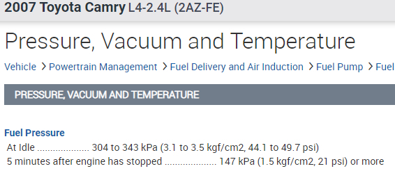 5 minutes after engine has stopped .................... 147 kPa (1.5 kgf/cm2, 21 psi) or more