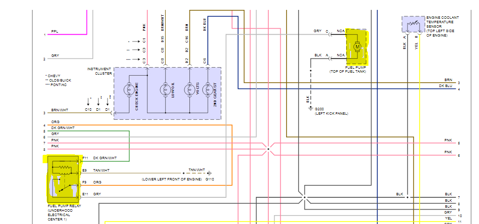 if all these tests are okay, check wire between the fuel pump relay and fuel pump, install the relay start the engine by using voltmeter check between gray and black wire 12 volts must display if not check for open circuit between relay pin 11 and pump wire gray, also check for ground connection between pump ground wire black and the body left kick panel.