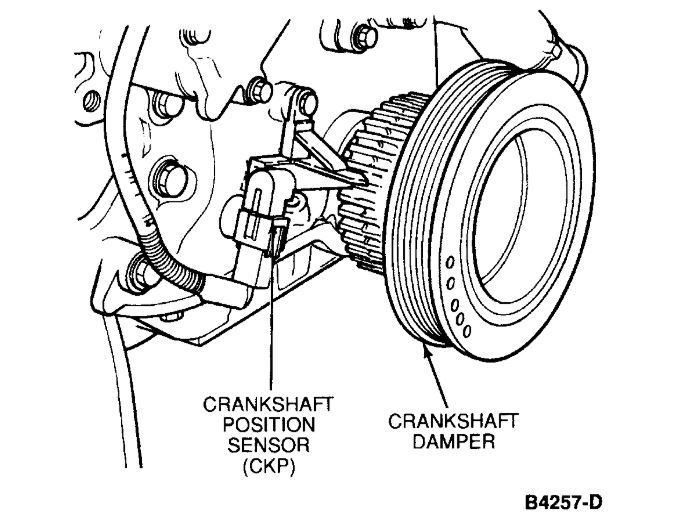 All functions of the ignition control module are contained in the power-train control module. The Ignition Control Module (ICM) receives the Crankshaft Position Sensor (CKP) signal from the CKP sensor. It processes the CKP signal into Profile Ignition Pickup (PIP) information and transmits it to the Power-train Control Module (PCM). The PCM processes the PIP signal along with signals received from the Throttle Position (TP) sensor, Mass Airflow (MAF) sensor, Heated Oxygen Sensor (HO2S), Engine Coolant Temperature (ECT) sensor, Octane Adjust (OCT ADJ), barometric pressure sensor, Vehicle Speed Sensor (VSS), and Brake On-Off (BOO) switch according to a spark advance map programmed into the PCM. The PCM produces a Spark Output (SPOUT) signal which it sends back to the ICM. Using the SPOUT and CKP information, the ICM switches primary current to the ignition coils among the three ignition coils and provides the optimum amount of spark advance and dwell. The ICM module also sends back to the PCM an Ignition Diagnostic Monitor (IDM) signal which the PCM uses to indicate a failure mode and which is also used to provide an RPM signal to the instrument panel tachometer.