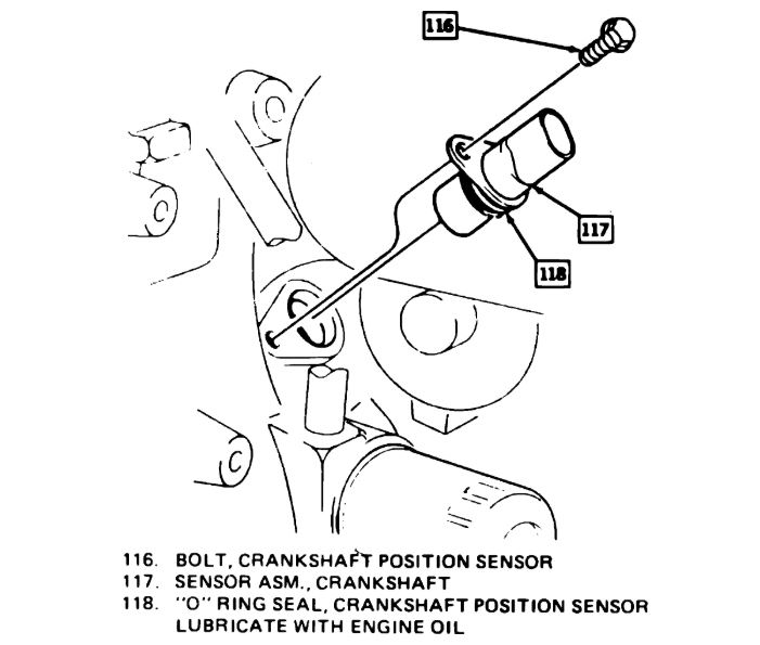 3. Reverse procedure to install. Replace sensor O-ring if worn or damaged, lubricating new O-ring with engine oil prior to installation. Torque crankshaft sensor to engine block bolt to 88 lb in.