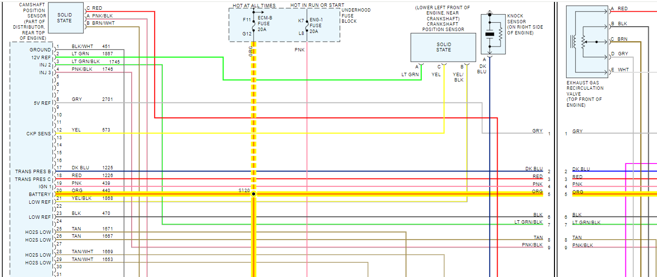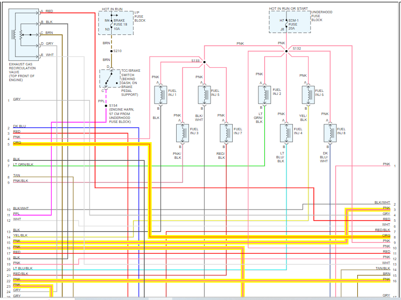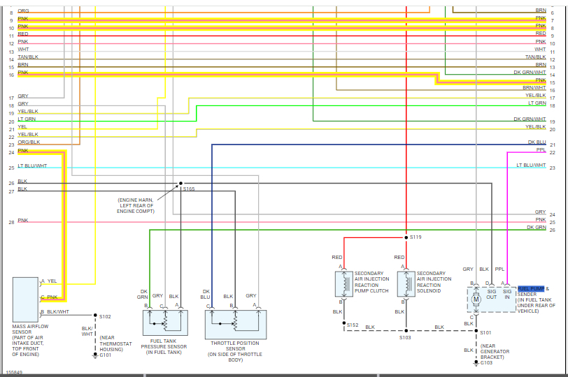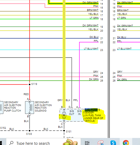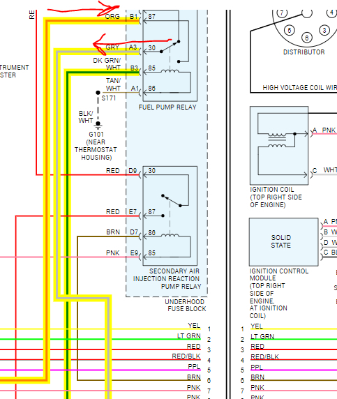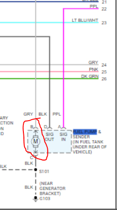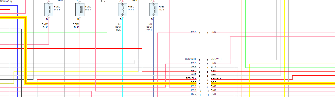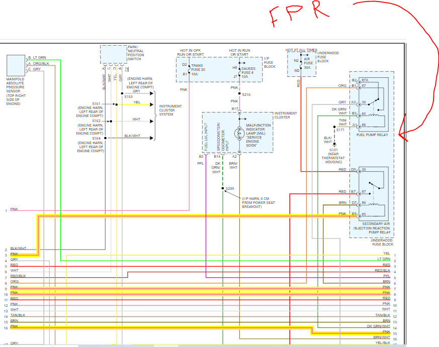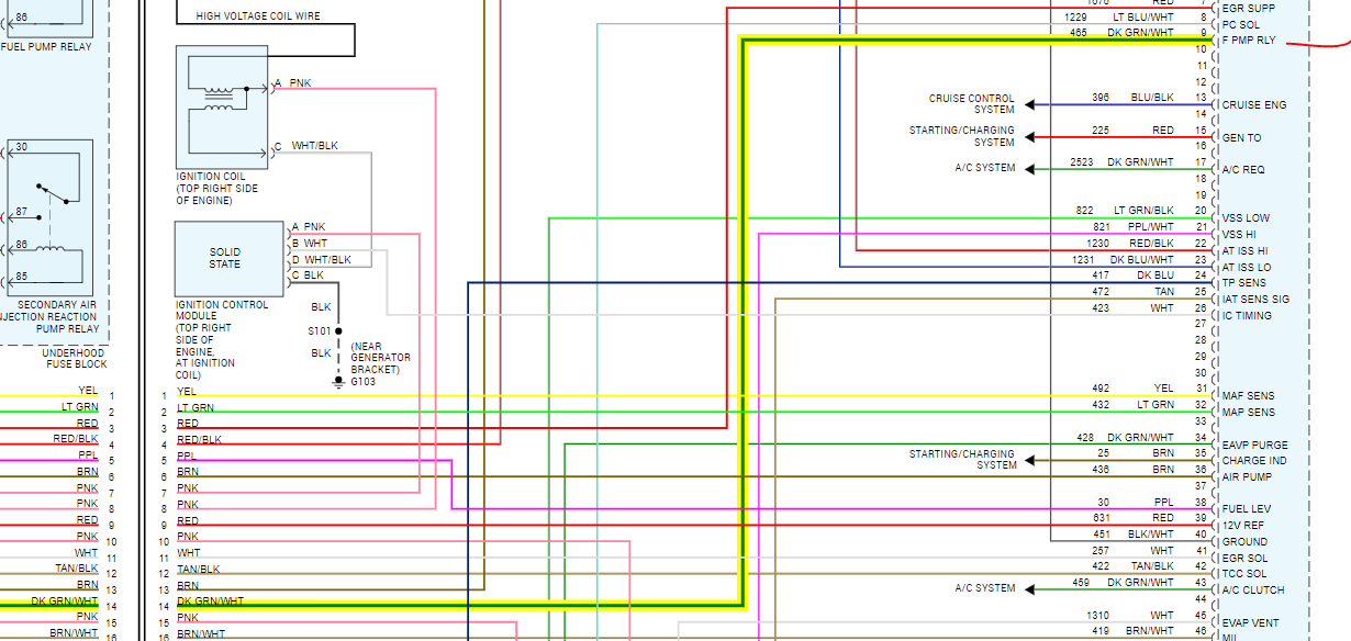 I attached the entire schematic below. However, to make it readable, I had to cut each page in half. I did overlap them so you can follow from one to the next. Additionally, I highlighted the wiring related to the two fuses that failed and indicated the location of the fuel pump relay.