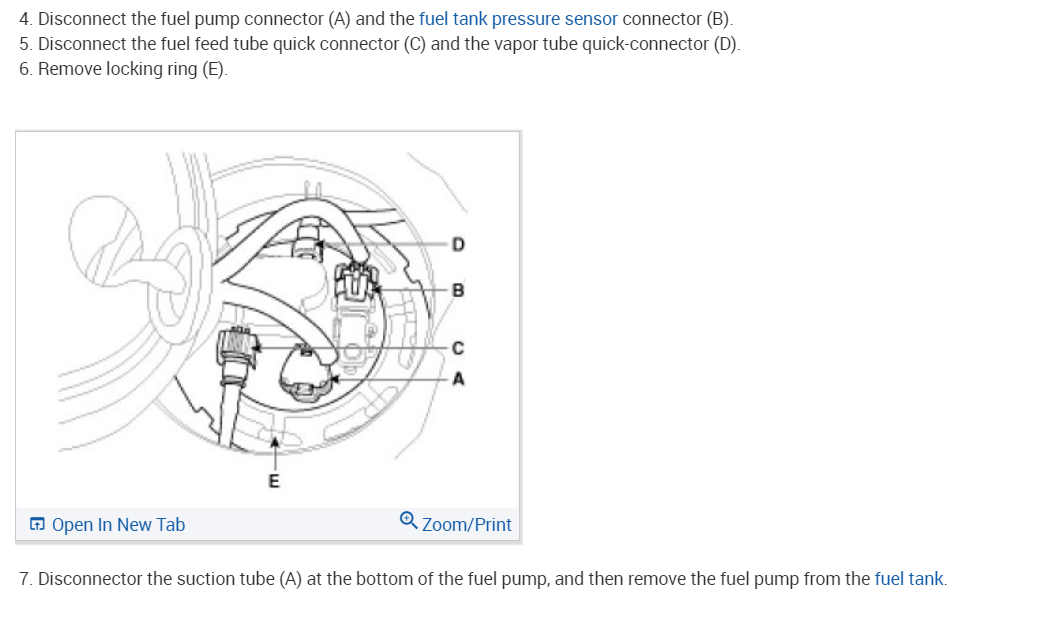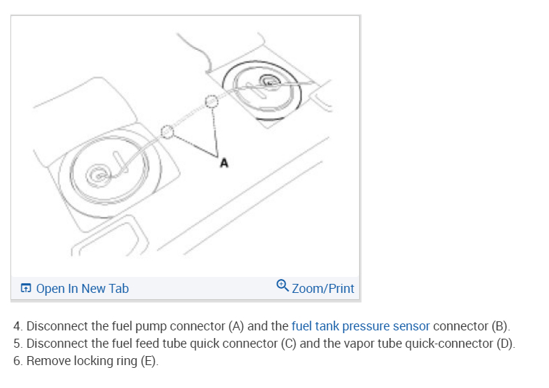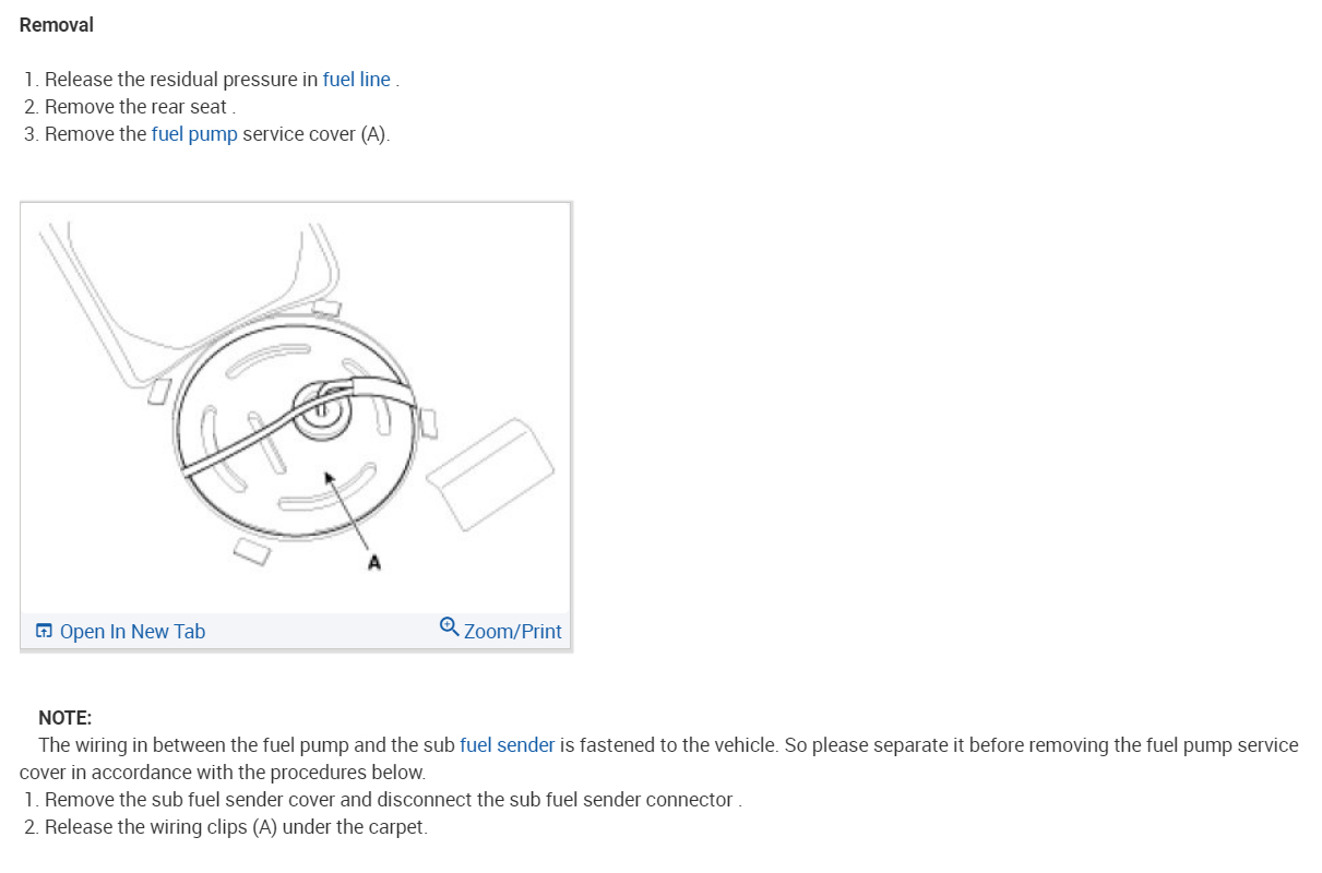 There is a trap door which is nice, so you don't need to remove the fuel tank. Here is the location of the door and how to replace the fuel pump in the images below. Check out the images (below). Please let us know if you need anything else to get the problem fixed.