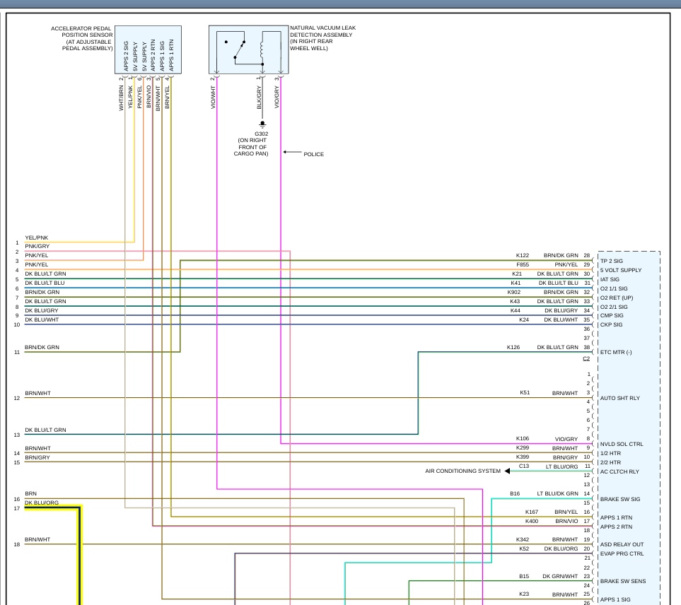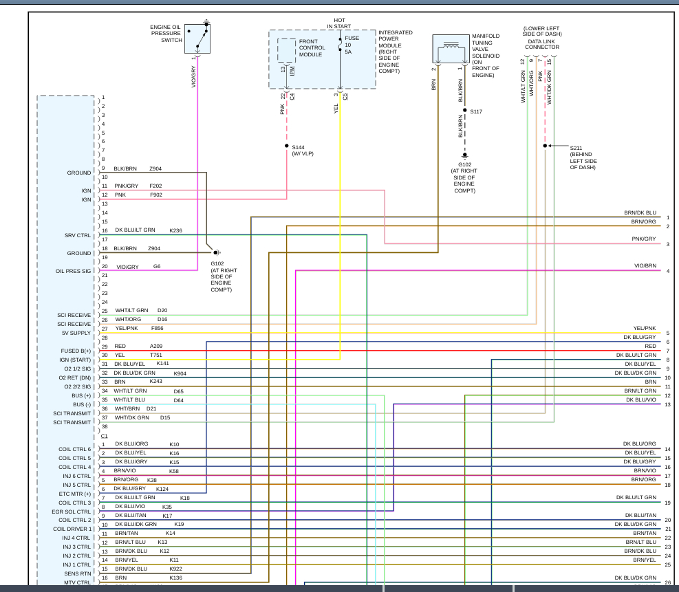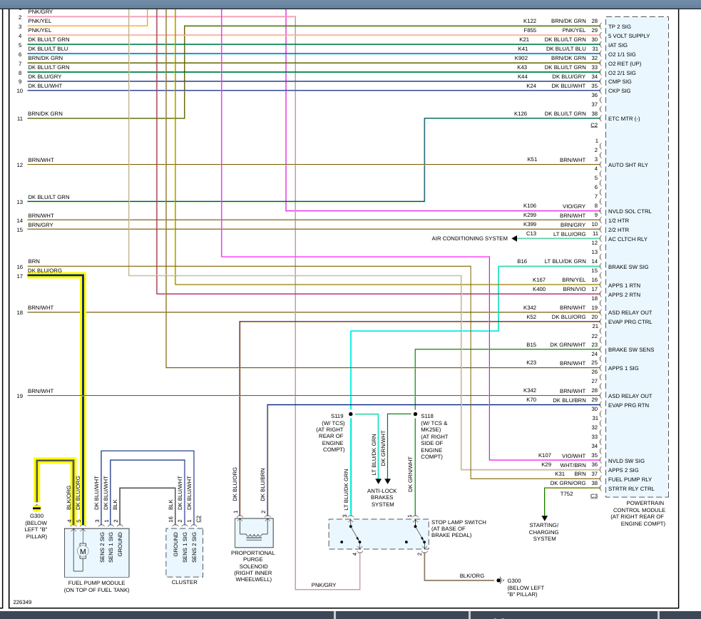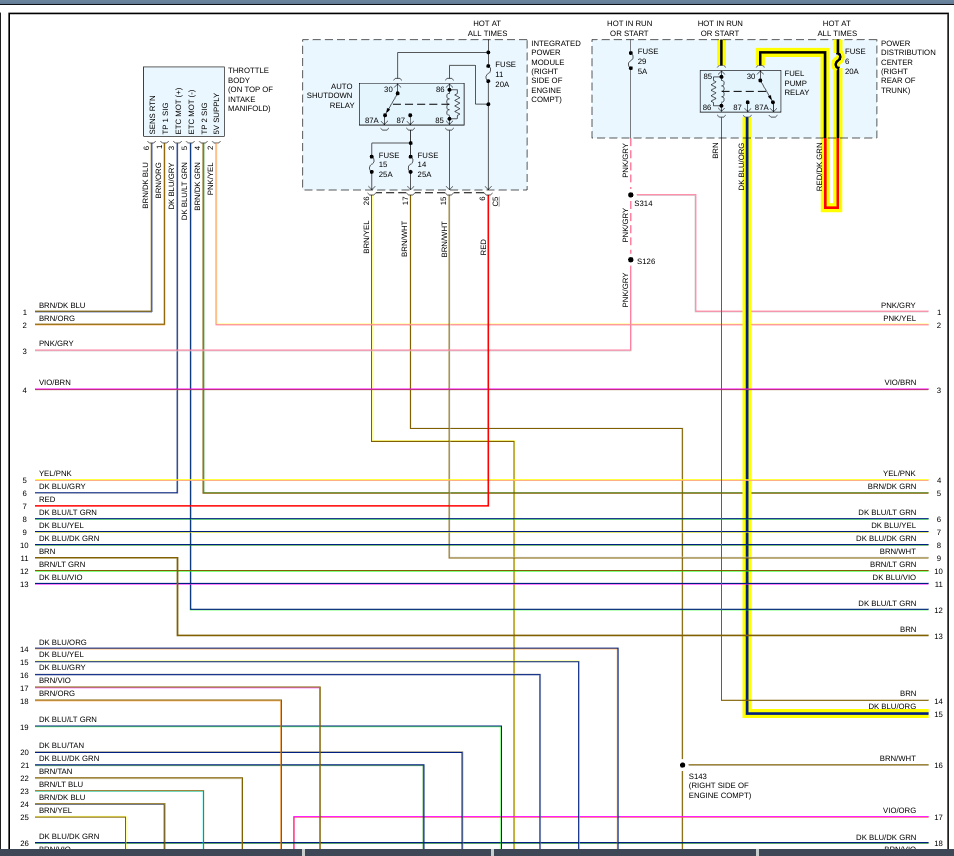 I couldn't find any wire diagrams of the fuel pump, but we tested the wires from the power distribution center and those are fine. We jumped the dark blue/orange wire straight to the positive battery terminal and the pump primes when you turn the ignition over. The car even runs great, but this is not a permanent solution.