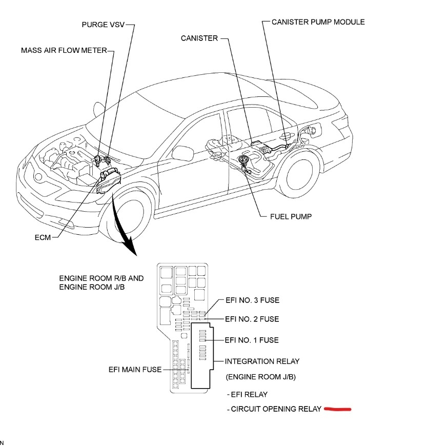 Then I would go to the ECM located behind the air cleaner housing and find the yellow wire on pin 7 of the A 24 connector. Use a back probe to apply ground to that pin. If the relay and control circuit are good the pump should turn on. If it doesn't then the relay may have failed.
