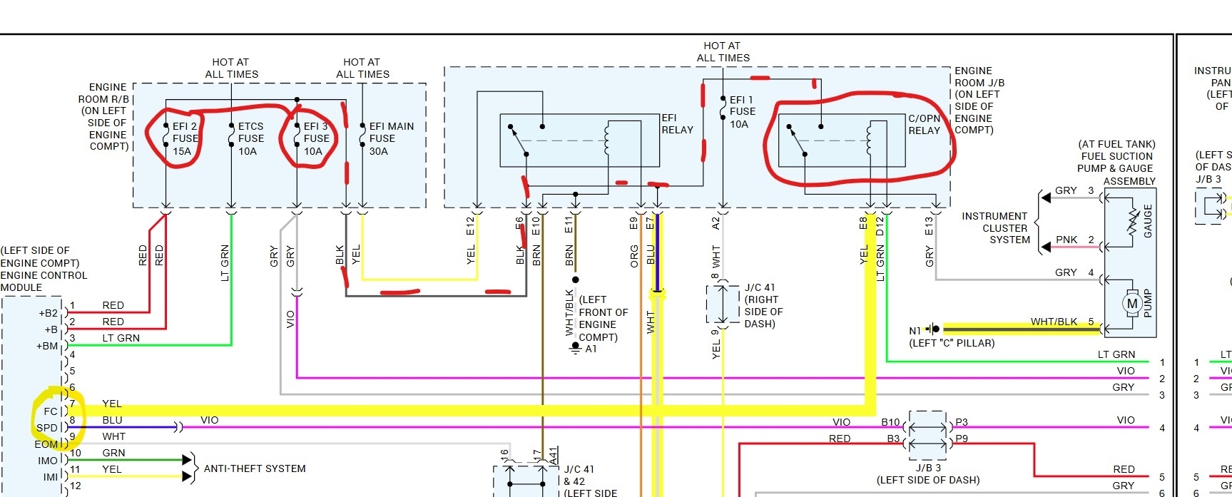 I would then use a scan tool to activate the pump using the ECM controls. If that same terminal now shows a ground and the pump still doesn't turn on, the relay on the board is suspect. So, we verify the power feed to it. The easy way to do that is to use the test light on fuse EFI 2 or 3 in the under-hood fuse box. They are powered from the EFI relay which powers the pump through the Circuit Open relay. If there is power to those fuses and the yellow wire is grounded and still no pump activation and no power at the pump connector. I would verify the pump connector itself doesn't have a bad terminal at the power feed. That can happen if the pump is failing, and the terminals heat up. If all the above tests okay,then you will likely need to replace that relay or the module it is in. The book time shows a half hour which is about right if the entire module was replaced. The last image is the testing for just the relay inside the box.