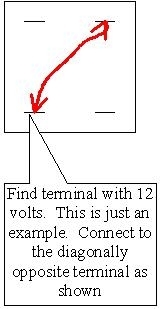 Another way to keep the circuit live is to bypass the relay with a jumper wire, but this is where you do have to know which terminals in the socket to jump together. If you have a relay that looks like one of the three in my first nifty drawing, jump terminals 30 and 87 together, or the two indicated. GM uses a lot of gray 1" cube relays with four terminals as shown in my second drawing. Use a test light or voltmeter to find which one terminal has twelve volts on it all the time. Jump that one to the diagonally-opposite terminal. That will turn the circuit on, then the bulb in place of the fuse will limit current to a safe level.