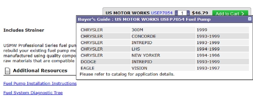 Do you have a donor vehicle in mind? If so, look up the part numbers for that one and for your model to see if they're the same. I use the Rock Auto web site. I found the pump itself is the same for all engine sizes for '97 and '98 Concordes, but not other car models. This also depends on how you're going to replace the pump. If you replace the entire assembly, the housing is different from year to year. If you take your housing apart and just put a new pump into it, those pumps interchange through multiple years and may be the same for a number of different models. The Dodge Intrepid is the same model but came with different options packages. The fuel pump is the same for a '96 model, and is likely to be the same for other years.
