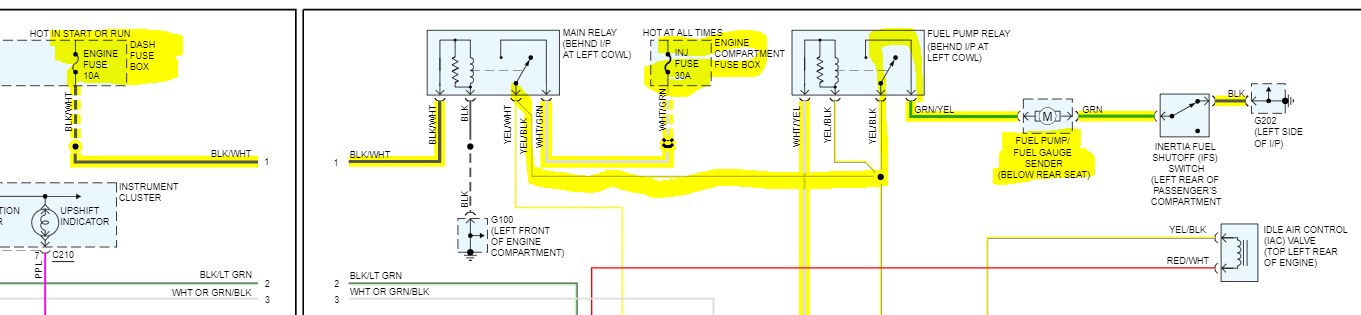 When the key is turned on, power from the 10-amp fuse in the dash fuse box sends power to the main relay (primary side) and actuates the relay. From there, power goes through the secondary side of the main relay from the injector fuse in the under-hood fuse box which runs to the fuel pump relay secondary side.