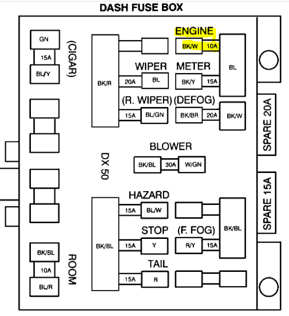 Okay, when you check the fuses, make sure the key is in the on position when checking the engine fuse. Otherwise, it won't have power. The injector fuse should have power at all times.