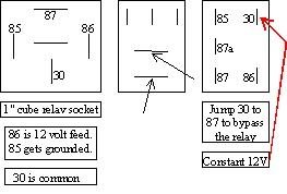 To bypass the fuel pump relay, remove it from the socket, then plug in a pair of universal crimp-style spade terminals into terminals 30 and 87. Use a pair of small jumper wires to connect them to the temporary fuse. For the benefit of others researching this topic, here's drawings I put together previously to show how this is done. The bulb is used to protect the circuit when a short occurs. Use a fuse instead of that bulb. The common 3057 brake light bulb shown will only allow a maximum of one amp to pass. That's not enough to run the fuel pump.