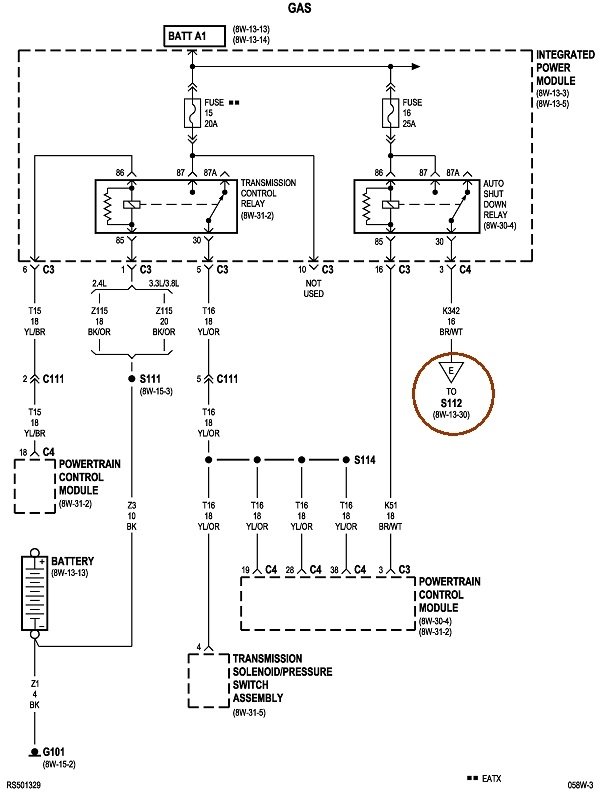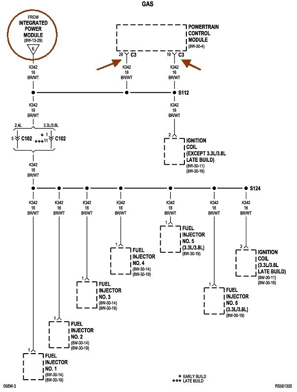 For my final comment of value, I added the last two diagrams to show the ASD relay circuits. Since the mid '80s, that relay feeds the injectors and ignition coil(s), as shown here, as well as the alternator's field circuit, oxygen sensor heaters, and in some cases, the fuel pump itself, or the fuel pump relay. One circuit that is usually overlooked is the additional circuit going back to the Engine Computer, shown with the two brown arrows. The computer thinks it turned the ASD relay on, and it gets verification of that on those two brown / white wires. (Those are also the 12-volt supplies for other circuits controlled by the computer).
