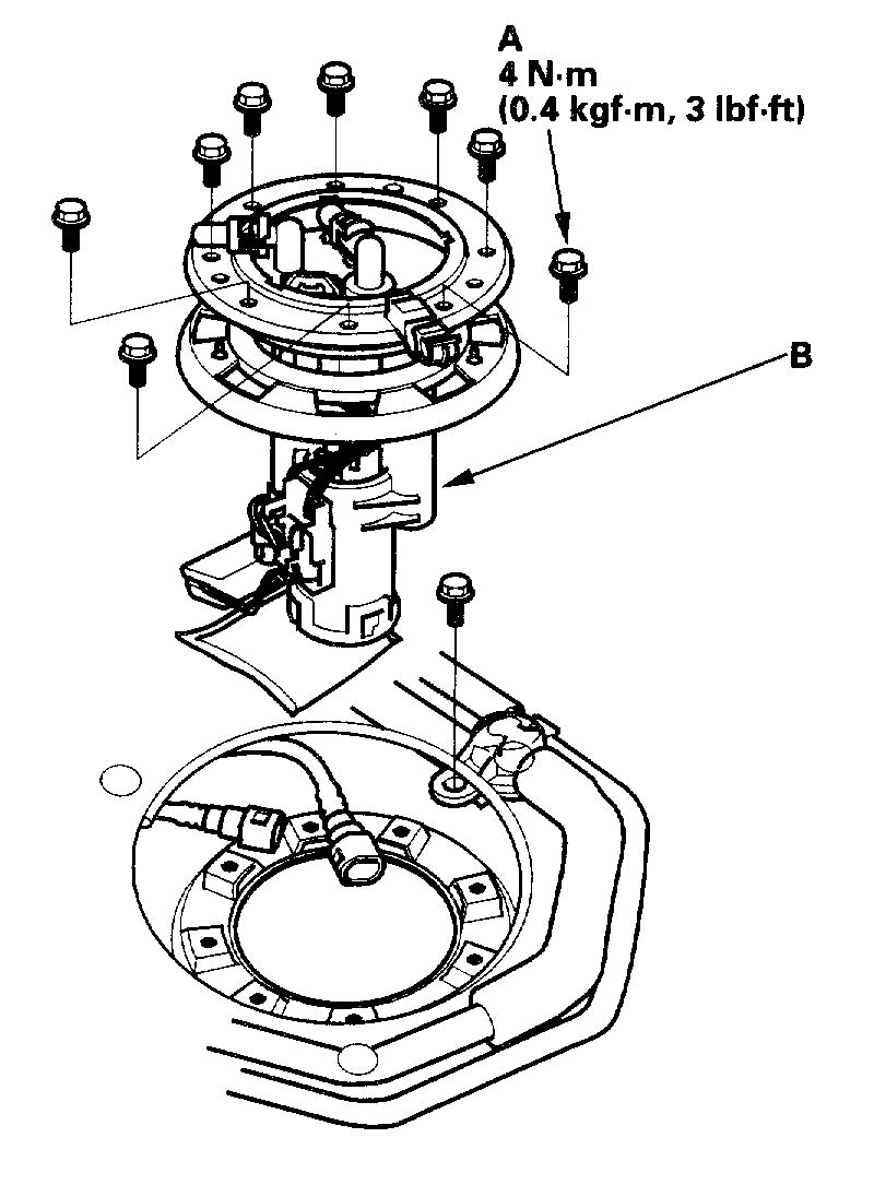 7. Remove the bolts (A), and the fuel tank unit (B).