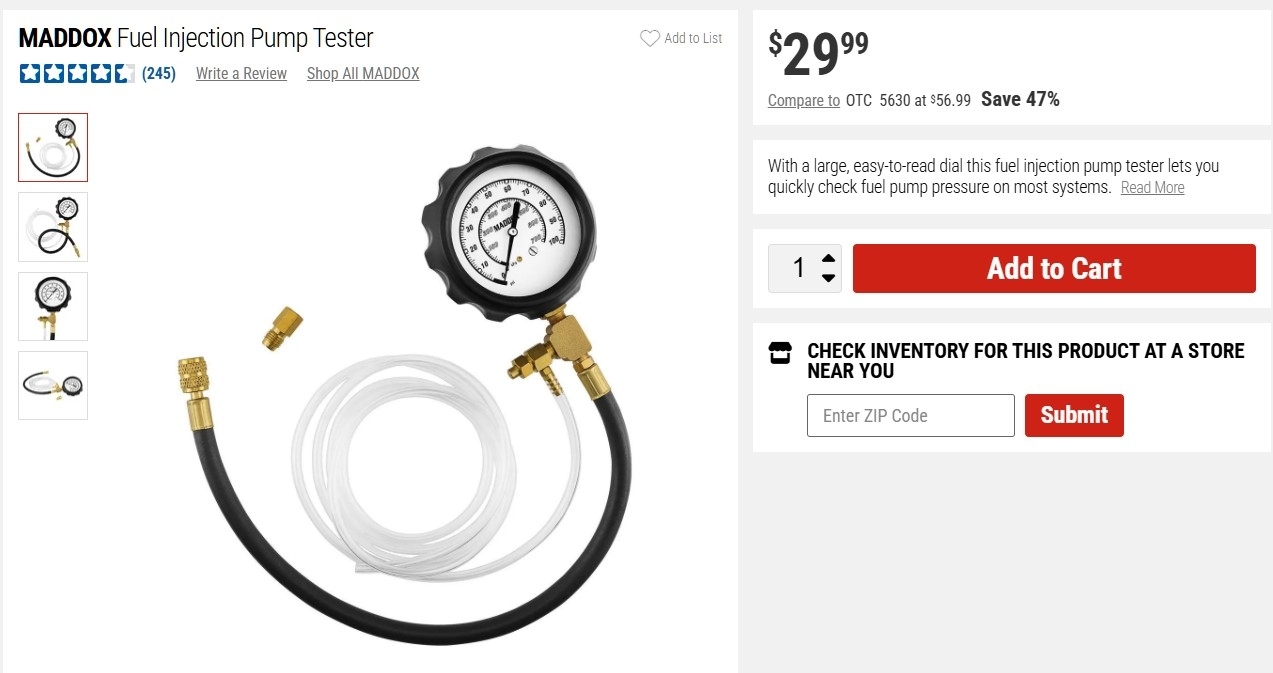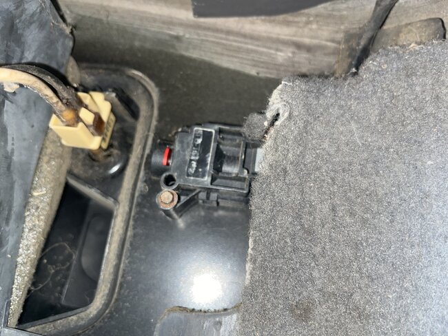 Yup, thats the switch, if you pull the carpet away a bit you will see the connector and 2 wires on the bottom of it, with these if I need to check the switch for whatever reason, Ill just keep it simple, I will check the voltage level on the Dark Green wire first, then check for the same voltage level coming out on the Orange wire. Most of time you can do this without even having to unbolt the switch, although that will make it easier, but I would grab a cheap multimeter somewhere, (walmart, autozone etc). You just need to read DC voltage and resistance in some cases (Ohms). So you can get a cheap meter probably for $20 or so, and this is Harbor Freight's cheapest fuel pressure gauge that does come with the Ford adapter, its the most common adapter out there.