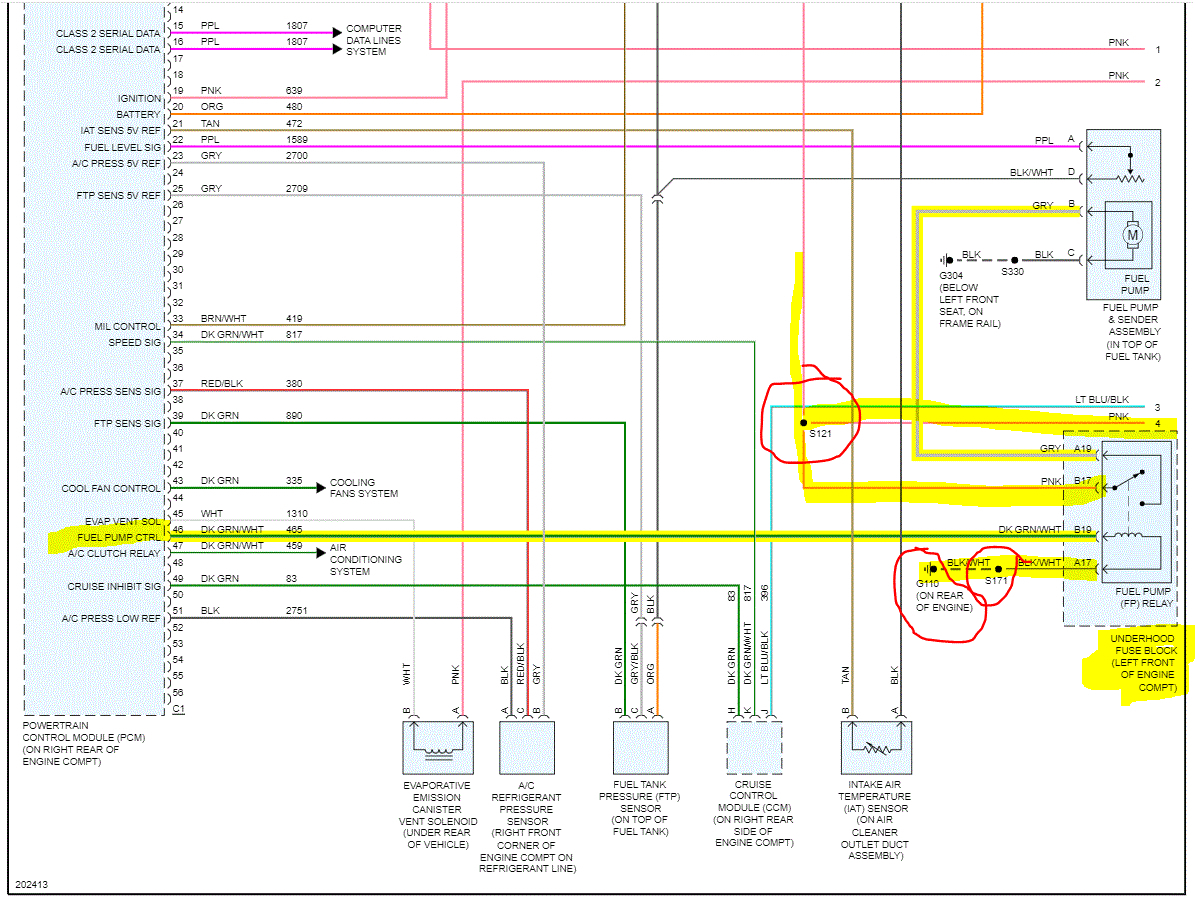 Here is where I strongly recommend starting, ground 110 at the rear of the engine. Not only is that the ground for the fuel pump relay but also, it is the ground for the data link connector that also isn't working. Take a look at pic 8 below. Start there. I have a feeling you are going to find either a partially broken ground, corrosion, or something is damaged at that point.