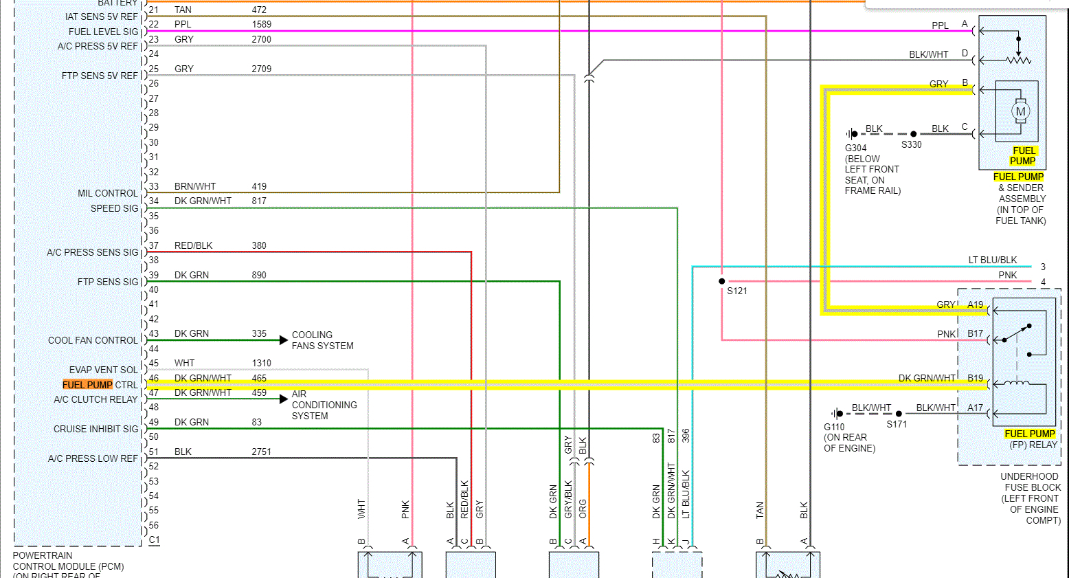 Actually, the PCM sends a voltage signal to the fuel pump relay to actuate it. Once that signal is applied, the relay closes and power to the pump and fuel injectors is supplied by fuse (F/P Inj) in the interior fuse panel.