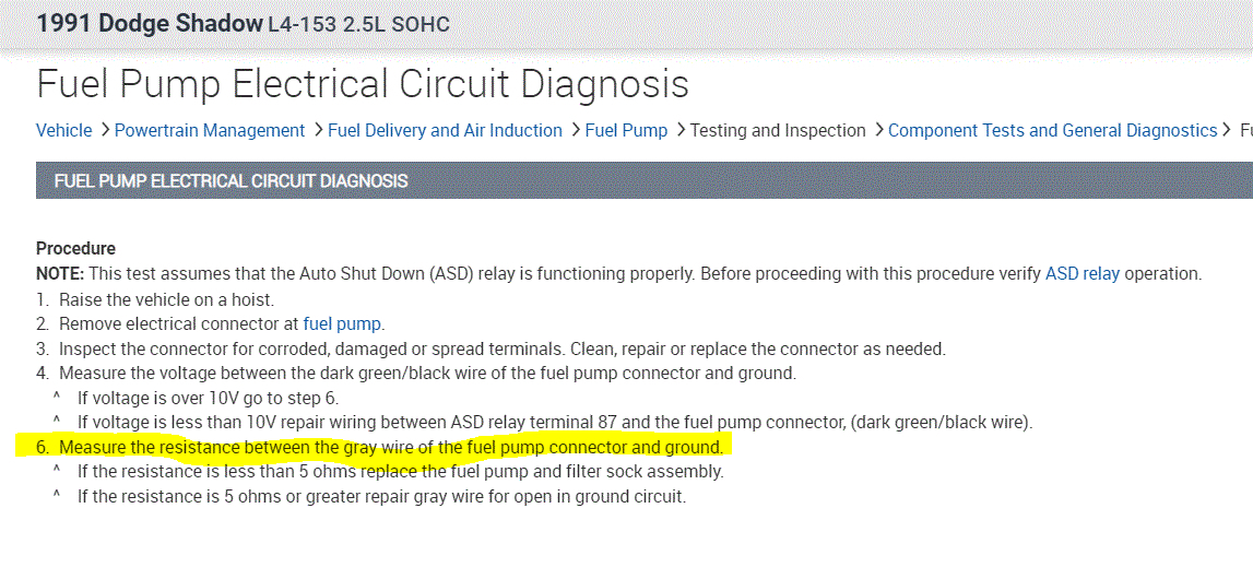 You can use a voltmeter too, but they usually don't respond fast enough. Have a helper run the ignition switch or prop the test light up so you can see it from inside the car. You will see it light up full brightness for one second when you turn on the ignition switch. That tells us the ASD relay and circuit are okay and the Engine Computer has control of it. Next, it must turn on full brightness and steady when you start cranking the engine. If it does, we have to focus on the fuel pump or the ignition system, but not both. If it does not light up during cranking, you won't have fuel pump, spark, or injector pulses, that's when we have to look at the Hall Effect pickup assembly.