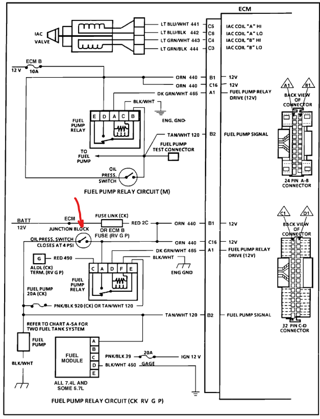 No power to orange wire on relay. Tracing this wire back to the junction block on the firewall side there's continuity through but the wire doesn't appear to connect to the under dash fuse block but rather joins into a loom that heads back, possibly to the ignition switch. Does this wire get its power from the switch? There's power to all the fuses under dash except ecmb, horn, tl/ctsy, instr. LPS. There's also no voltage to the either orange wire labeled batt. In the upper left of the block. This is a crank, no start but if fuel is poured in the TBI it starts right up. Can't hear fuel pump prime and when power is supplied to the short red test wire on the relay the pump doesn't run. Continuity tests through all fusible links and main grounds are clean and tight.