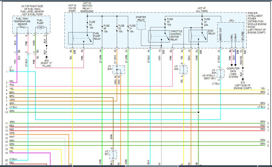 The fuel pump relay is located in your vehicle's Intelligent Power Distribution Module Engine Room[IPDM ER]. In the diagrams down below I have included a wiring diagram of your vehicle's fuel pump and the location of the IPDM. Here is a link below on how to bench test a relay below: