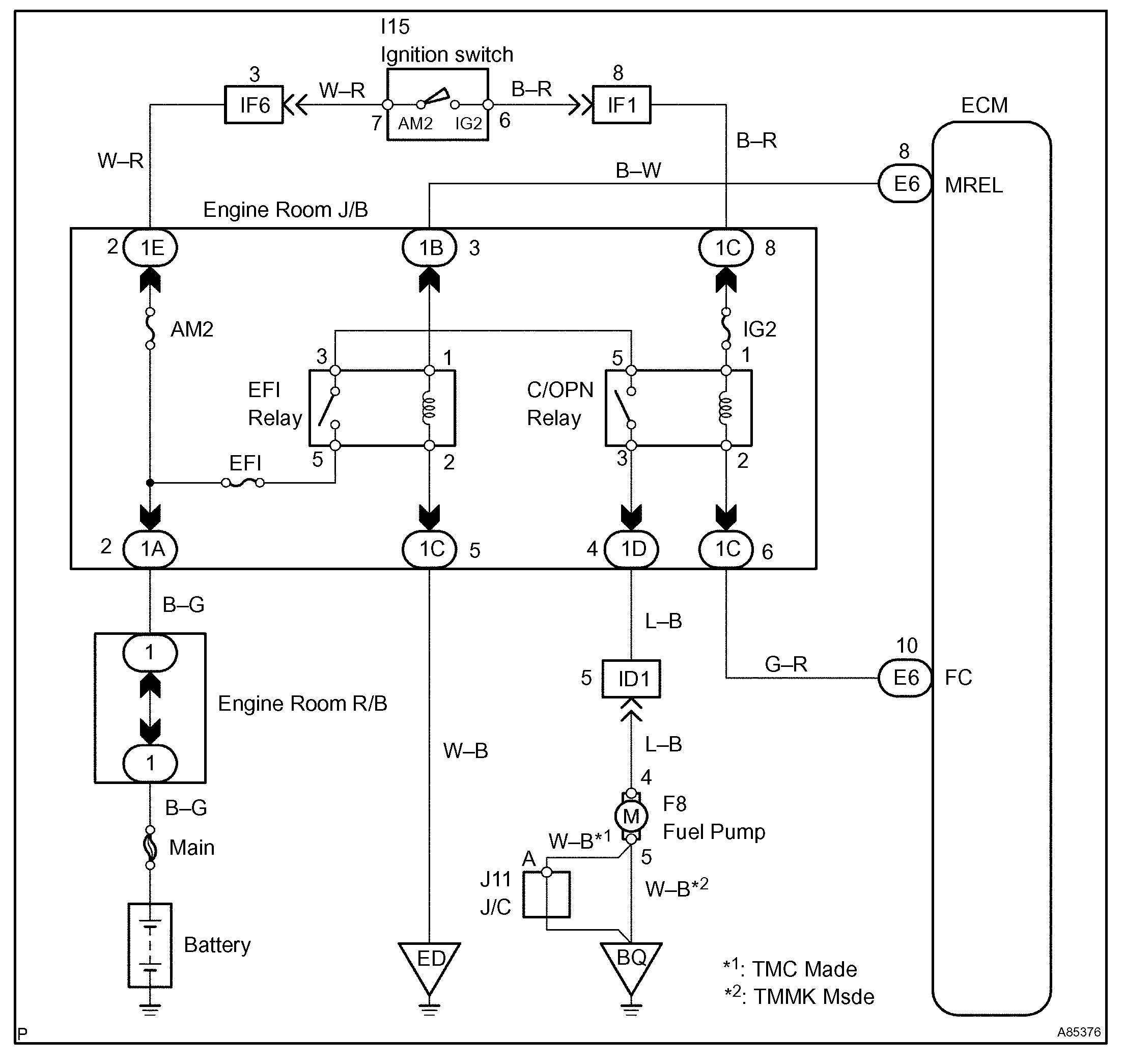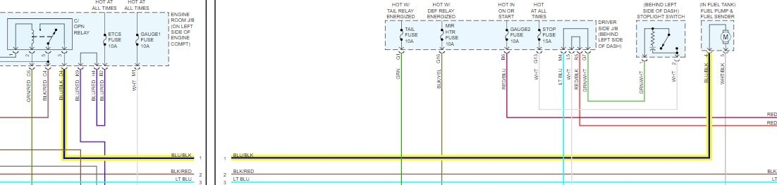 No problem. I attached a schematic of the fuel pump system. This is the OEM schematic, so no colors are listed. However, if you identify which wire you are looking for, I will try to identify color via a different manual.
