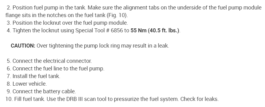 Thank you very much for the information about the fuel pump! The replacement solved the problem. Now if I could ask another question pertaining to the right rear brake pads dragging on the same vehicle-2001 Sebring convertible 2.7. This is my Grandson's vehicle so I only see it when he has an issue. The right rear brake stayed partially applied and when he arrived the pads were wore down to the metal. I replaced the pads, rotor and caliper after removing all rust and build up that may have interfered with the movement of any contacted new parts, everything moved freely as it should have. Fast forward 700 miles. He arrived again with the same issue. The brake components were so hot the caliper piston boot melted. I took all parts back and had them replaced under warranty and installed them. Fast forward 1,000 miles, I checked and the pads on the the brake - half gone, the driver side pad were replace at the same time and are not noticeable worn. I checked the rotation of the tire and noticed a slight drag, then took the tire and rim off and checked the rotation, there was drag and the caliper had free movement, but the pads and rotor moved with the caliper. I then again took all parts off and looked for anything that may have obstructed brake fluid flow. I found nothing. I checked to see if the flow from the other rear brake was the same when loosening the bleeder valve and it appeared the bad brake line was similar, possible a little slower. I tried to trace the line from the caliper to the reservoir but could not. Then took off reservoir cap and put 110 ponds of air pressure into the brake line to see if it may have restrictions. The reservoir did not rise. I'm baffled? Any suggestion would be appreciated.