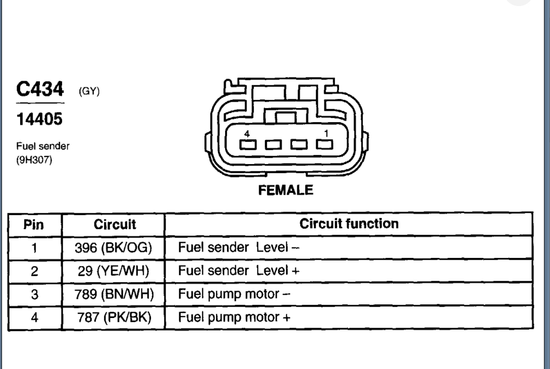 Hi, i need the wiring color codes for the plug going to the fuel pump please. While changing the fuel pump I tore the wires out of the plug that goes into the fuel pump. bought a new plug but can't remember what wires goes where. TIA