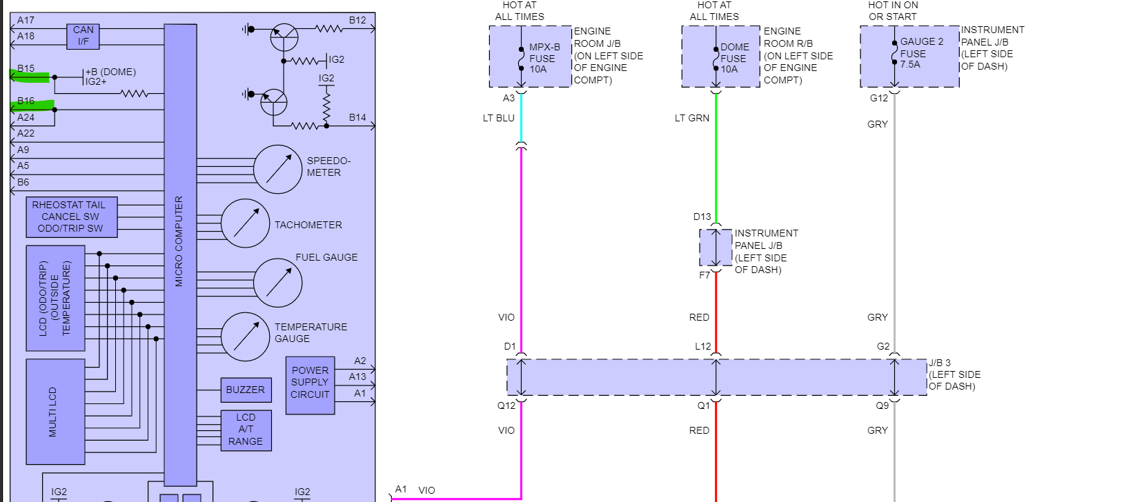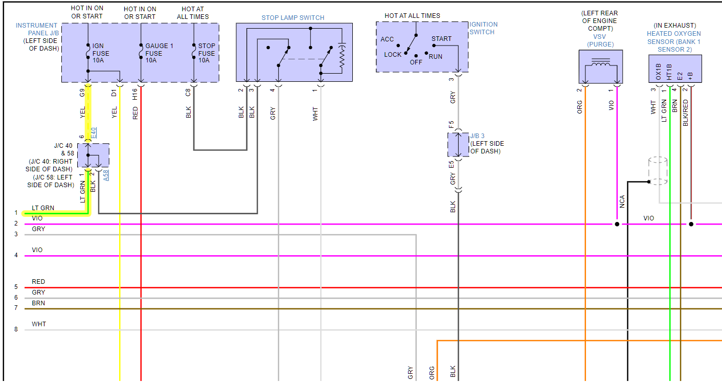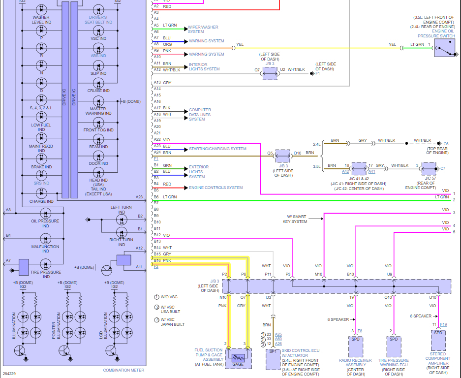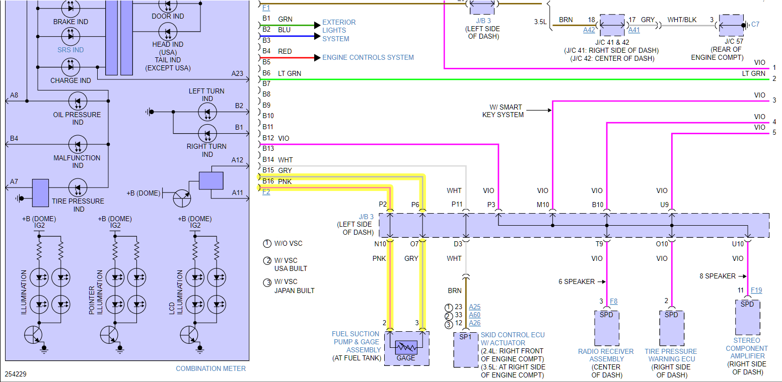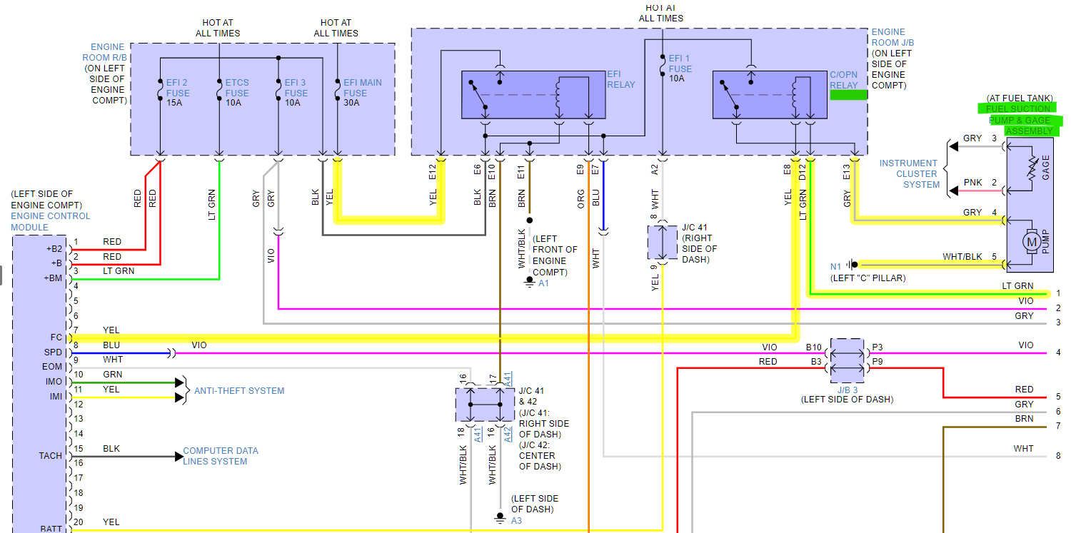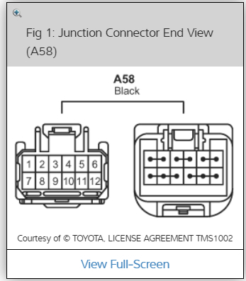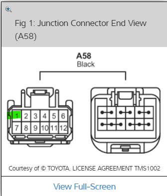 Okay so, you're talking about the pink wire coming from the fuel pump area. I only see 1 pink wire and one other grey wire besides the Fuel Pump feed wire which is also grey. I think what you're seeing is the pink and grey wires that are for the Fuel Gauge. The A58 connector doesn't have any pinout unfortunately. I've looked everywhere and all I can find are these two diagrams (1st 2). In the 2nd diagram I believe that is the A58 Connector coming out of that panel on the driver's side. It's the only 12 pin connector that matched up. But I don't think that is what you are looking for. The third diagram is the Fuel Gauge sending unit to the instrument Cluster. Thats the big purple colored component to the left. The gauge wires run through the J/B 3 connector. Finding that J/B #3 was really tough, but it's up on the driver's side, looks like it's more up above the gas pedal area. The 6th diagram is the fuel gauge circuit it's the OEM from Toyota, and not very helpful. But you can see where that pink wire goes and what it's for. And on the seventh diagram are the pins inside the instrument cluster for pins # B15 and B16 which is the fuel gauge circuitry. So, it should have 12volts going out on one of those wires and then you can see on B15 it has a resistor coming off that circuit inside the cluster, so that would be a voltage sensing circuit coming off that resistor for the gauge reading. Hopefully this all will give you what you need. Sorry it took a while to find all this.