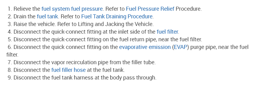 I would take a set of metric 3/8' sockets, ratchet, and extensions, a set of metric wrenches, phillips/flat head screwdriver, utility knife, GM quick connector release tools and that should really be it. I have also included the instructions for the removal, disassembly, reassembly, and installation of the fuel tank for this vehicle in the diagrams down below. Please get back to us and let us know how everything turns out, or let us know if you need anything else to help.