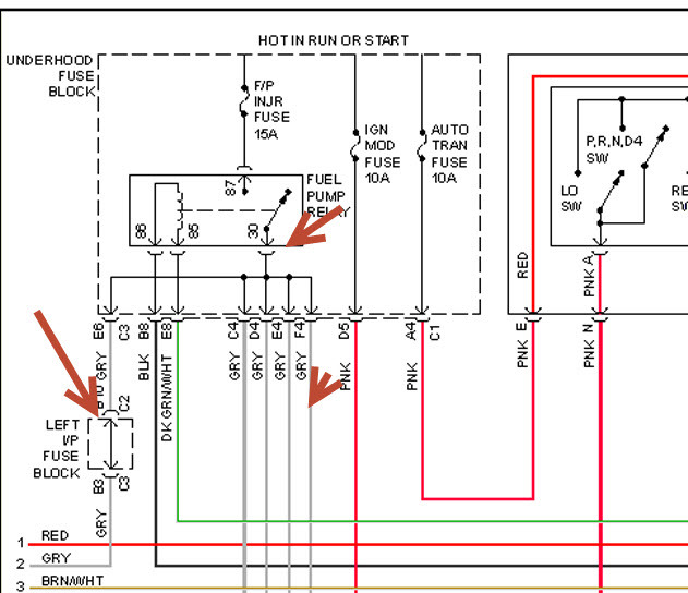 Thank you sir for replying and bearing with me. And yes, there is a certain amount of guessing on my part, but only because I have asked 3 different "experts" so far about my problem and have gotten 3 different answers. This is a 2000 Oldsmobile Alero with a 2.4 L engine. I'm sorry but I thought I had said that before. Some say pin #85 is ground and pin #86 is hot coming out of the PCM. Others say the opposite. Some say pin #87 is always hot with the key in the "on" position. You seem to be telling me that pin #87 is getting it's hot from the oil pressure sending unit (which would only be hot once the engine achieves oil pressure, ie; during cranking or running) That makes more sense to me at least over the others. Also, some say pin # 30 is the grey wire leading straight to the fuel pump. You seem to be saying that it powers the injectors. Unless, you meant that it powers both. If I understand you correctly, you seem to be indicating that 86 is always ground to the coil inside the relay and 85 supplies hot from the PCM to the coil for 2 seconds which closes the contacts between 87 and 30 and primes the fuel pump. Where I'm getting confused is this: With the key in the "on" position (and not cranking or running) then how is 87 getting power from the oil sending unit to power the fuel pump on for 2 seconds? Are you saying that THAT power comes from the PCM itself via pin 85 for 2 seconds and then once cranking or running the coil opens back up and then the power comes from the oil sending unit? ( In other words the little coil inside the relay is only energized for 2 seconds to prime the pump and then the rest of the time it's open as long as the engine is running and has oil pressure?) But wait, what would be holding the contact between 87 and 30 closed then? I thought the little coil did that. Now, I've confused myself even more. I thought I was on the right track for a minute at least. Could you do me a favor and run it down for me step by step as for example: