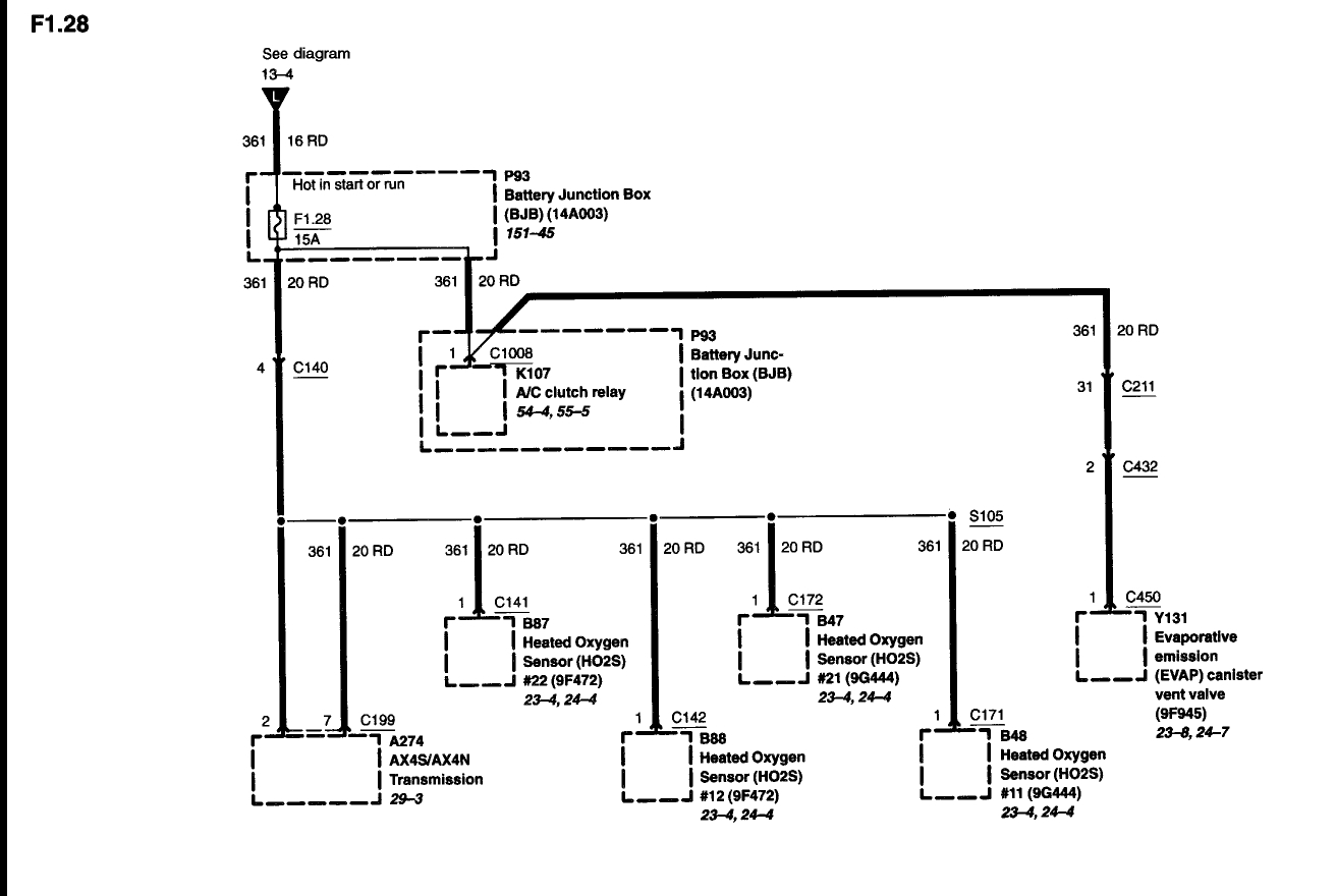 That fuse powers the transmission controller, the A/C clutch, the oxygen sensor heaters and the EVAP vent valve.