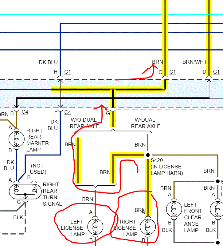 If the left rear parking lights are working, they should too. The fuse is in the under hood fuse box. I attached pics below. The first three are from the wiring schematic showing how power is distributed. I started at the license lights and then have arrows pointing it back to the power source / fuse. The third pic shows fuse location. Pic 4 shows the fuse in the box.