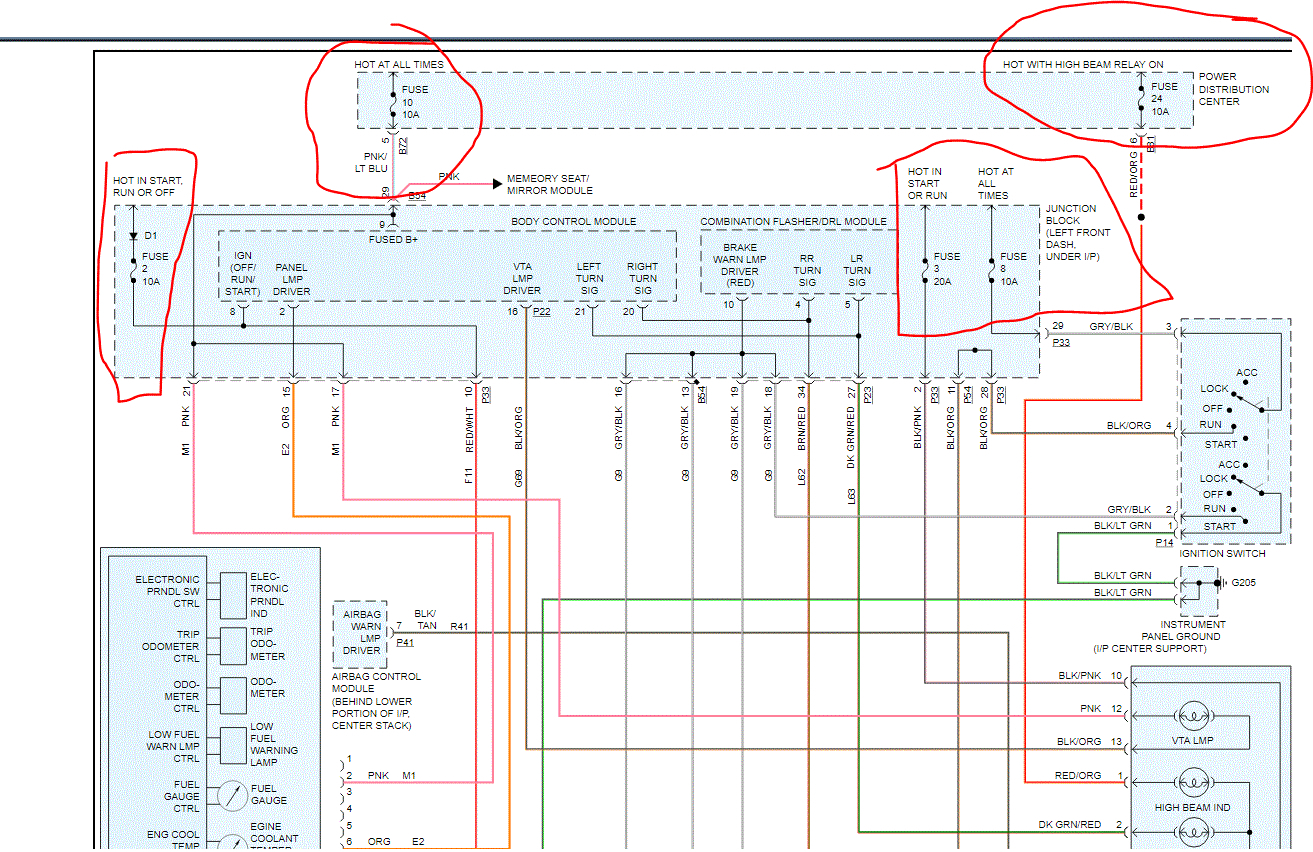 If the fuses are good, have power both in and out, then you need to go to the instrument panel connector and check for power at the three wires I highlighted. See pic 4.