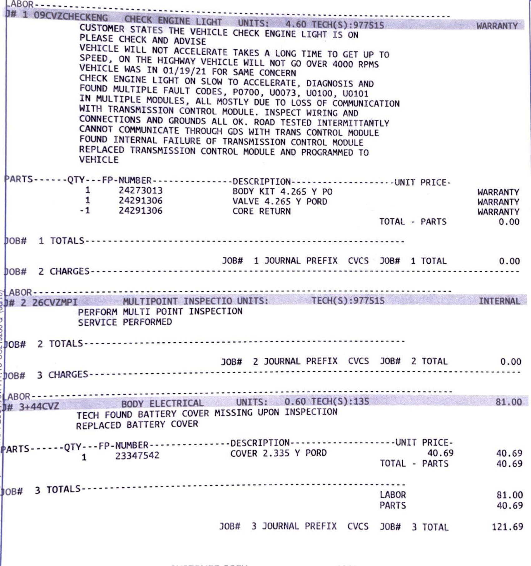 The dealer replaced the TCM and a few other parts (see attached pictures) and that cleared the issue for about a month. Then I fully broke down and was barely able to make it over a hill; I had to have it towed because it was not recognizing what gear I was in. When I tried to put it in reverse, the whole car moved back and forth three times before going into reverse, but again, it wasn’t showing I was in reverse on the dash. When this happens, the indication that I'm in drive (D) flashes on the dash and sometimes even turns off and doesn't even display what gear I'm in.