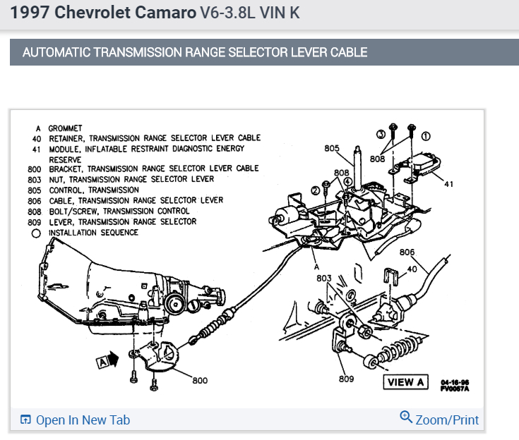 1. Grommet on cable (806) to base of automatic transmission control (805) by feeding cable (806) through hole in front compartment floor pan.
