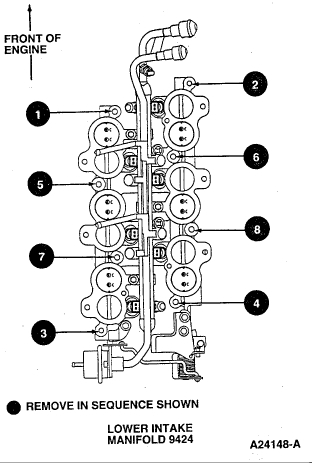 Remove lower intake manifold to cylinder head retaining bolts in sequence shown.