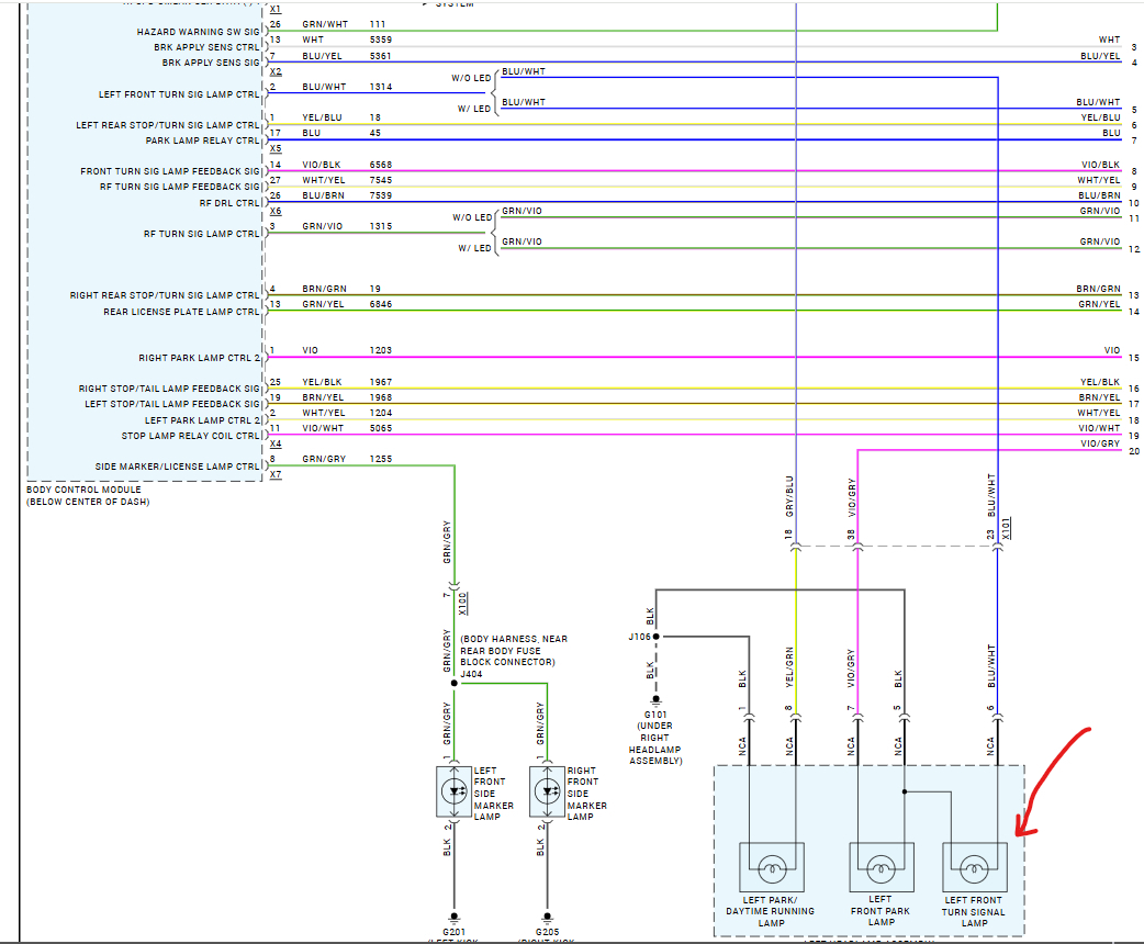 On my 2023 eqinox The left front and right rear turn signals are showing they are not working. The bulbs do not light up because power is not being delivered to the bulbs.I checked all bulbs, wires, grounds. Everything seems good except I believe the bcm is not functioning properly. I need the pin out wiring diagram so I can check each wire.