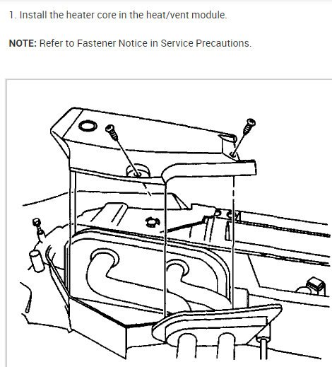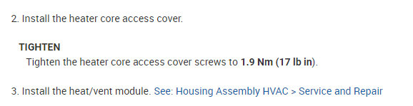 Install the screws to the heater core access cover-auxiliary and tighten to 18 inch lbs. (2 Nm).