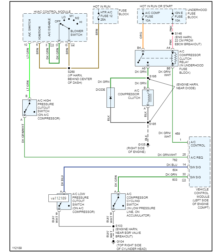 I am attaching the wiring diagram, but we need to start with checking the relay and finding out if you have 12 volts on both terminals from the fuses. If you do then jump the relay and make sure the compressor will come on.
