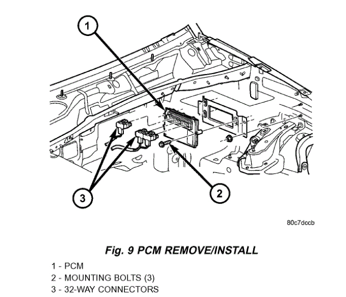 Use the DRB scan tool to reprogram the new powertrain control module (PCM) with the vehicles original identification number (vin) and the vehicles original mileage. If this step is not done, a diagnostic trouble code (DTC) may be set.