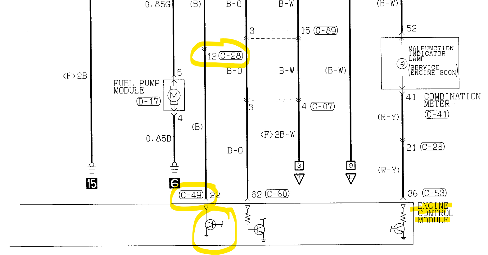 The C28 connector looks like it's in a pretty difficult place, somewhere in the lower center console. So, checking the circuit from the relay to the ECM connector for an open circuit to begin with will be easier. I'll find the ECM pinout.