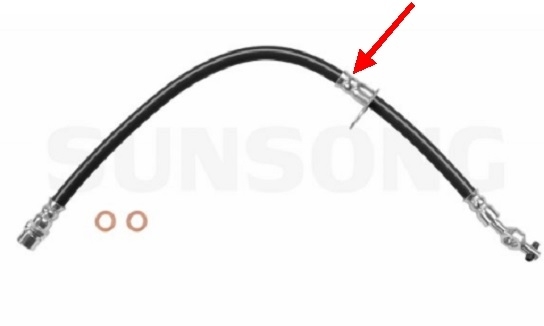 Hopefully you'll find the sticking brake doesn't release when you open the line at the master cylinder. That proves the restriction is further down the line. This is where the rubber flex hose is the best suspect. Chrysler's design uses a metal mounting bracket that's wrapped around the hose in the middle. Over time, rust builds up inside that crimp, and that constricts the hose. Brake fluid is hard to push through that restriction, so the brake pedal is high and hard, and the fluid can't release, causing the dragging brake. That crimped bracket can easily be opened up with a large flat-blade screwdriver or with a large channel-lock pliers. This photo shows Toyota's front brake hose and the arrow is pointing to the bracket where the rust gets underneath to squeeze the hose. This design doesn't have a means of opening it up, so the hose has to be replaced. If you're going to replace it, loosen the hose from the steel line first, then you'll see the brake is still sticking. That will be proof the restriction is in that hose.