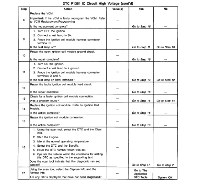 Once the VCM calculates the ignition timing, the ignition coil module on the IC circuit receives the timing signal. Each timing pulse received by the ignition coil module, on the IC circuit, triggers the coil module in order to operate the ignition coil. The secondary ignition voltage is induced, and then the secondary ignition voltage is sent to the distributor for distribution to each spark plug. This DTC is a type A DTC.
