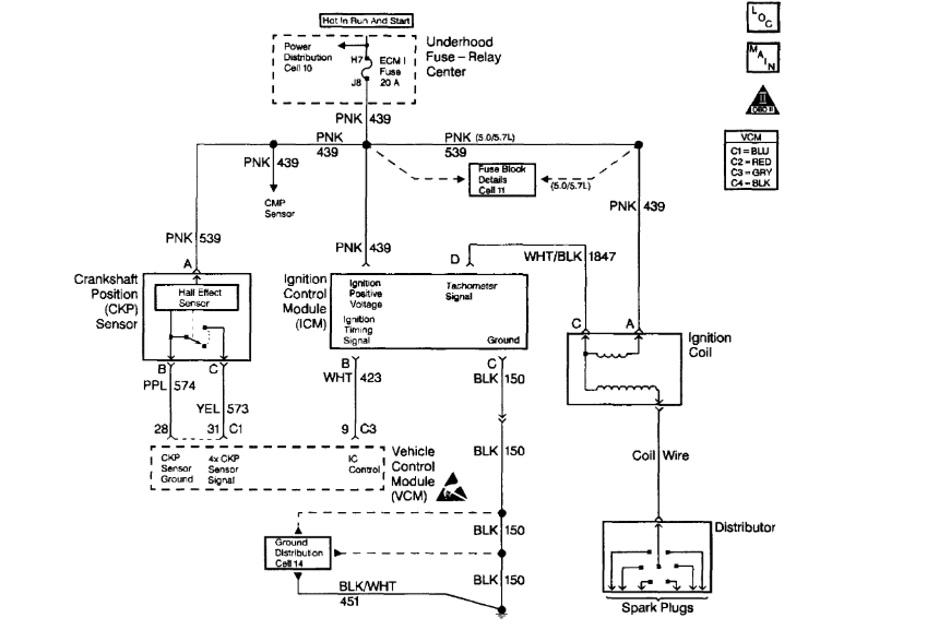 The enhanced ignition system provides the timing input to the VCM with a crank sensor. The VCM uses this reference pulse in order to determine the individual ignition spark timing for each cylinder.